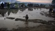Des migrants font la queue, mardi, aux environs des restes calcinés du centre de rétention de Moria, dans l'île grecque de Lesbos. Crédits photo : LOUISA GOULIAMAKI/AFP
