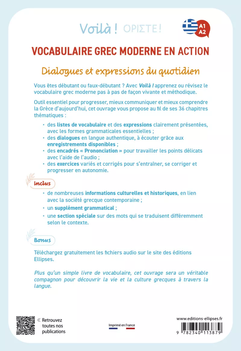L’ouvrage comprend également des encadrés consacrés à la culture, à l’histoire et aux traditions grecques, ainsi que des repères phonétiques pour aborder les principales difficultés de prononciation.
