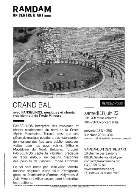 Dans le cadre de lasemaine autour de la culture hellénique à Ramdam, Un centre d'Art, bal avec le groupe Pansélinos, en formation 5 musiciens, avec un maître à danser pour faire vivre le bal.