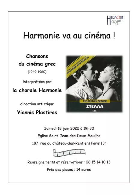 Les choristes de la chorale grecque de Paris "Harmonie" vont interpréter des chansons extraites de films grecs, essentiellement des années 1950-60, époque qu’on pourrait appeler « l’âge d’or » du cinéma grec. Interrompu par la deuxième guerre mondiale puis par la guerre civile, il a alors repris son essor, proposant un nombre impressionnant de films souvent devenus de grands classiques, de même que certaines des chansons qui y sont interprétées.