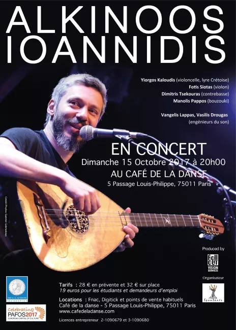 Alkinoos Ioannidis, l’auteur-compositeur et interprète le plus apprécié de Grèce, donnera un concert le 15 Octobre 2017 au Café de la Danse, à Paris. Découvrir les compositions d’Alkinoos, ses rêves et son univers, c’est entrevoir l’union de ses origines chypriote et grecque. Le programme musical est éclot de la rencontre de quatre grands solistes et un auteur-compositeur. Alkinoos et son Band, créaient l’alliance entre la musique actuelle, la musique traditionnelle, le rock, la fusion et le jazz. Ils s’offrent la liberté de coexister par l’improvisation tout en respectant la simplicité et la franchise que permet la chanson.