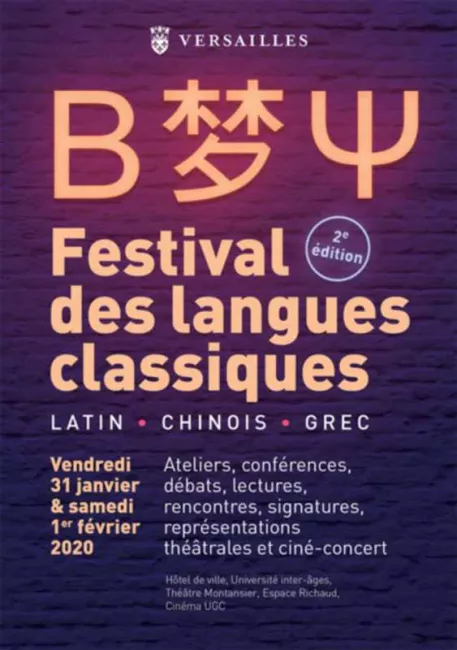 Pendant deux jours, le latin, le grec ancien et le chinois classique sont à nouveau à l’honneur à Versailles. Lectures, spectacles, concerts, conférences, ateliers, rencontres et signatures d’ouvrages se succèdent sur les différents sites. Ce festival, qui se veut à la fois savant et ludique, repose sur le soutien et l’engagement des meilleurs connaisseurs de ces différentes cultures ainsi que des enseignants qui en sont aujourd’hui les passeurs. En partenariat avec les Éditions des Belles Lettres, l’UVSQ, Sorbonne Université et l’association Démodocos.