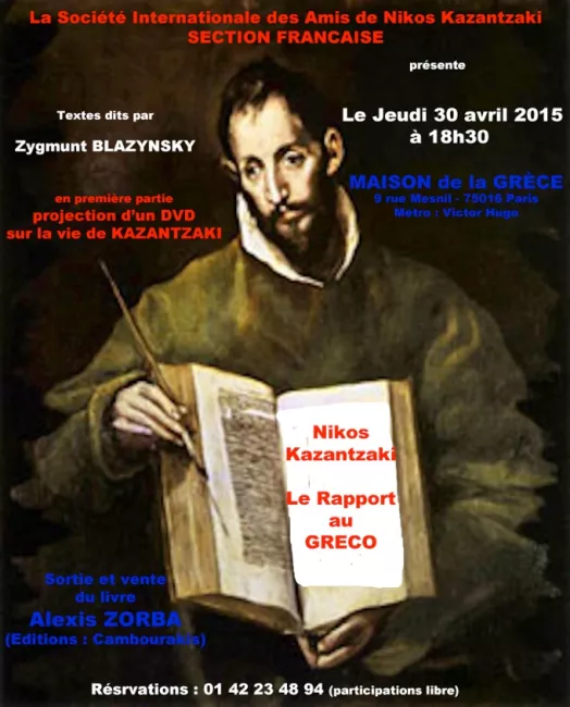 A l'occasion de la réédition en français du livre "Alexis Zorba" de Nikos KAZANTZAKI, lecture de textes de "Rapport au Greco" par Zygmunt Blazynsky. En première partie, projection d'un DVD sur la vie de Kazantzaki.