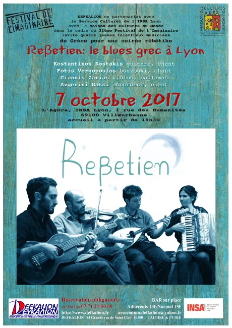 L'association Defkalion en partenariat avec le Service Culturel de l'INSA, la Maison des Cultures du Monde, dans le cadre du 21ème Festival de l'Imaginaire, invite le groupe Rebetien composé de quatre talentueux musiciens venant spécialement de Grèce.