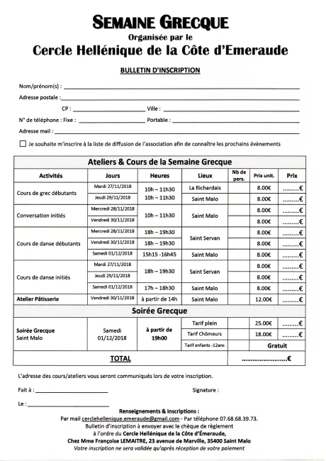 Le cercle Hellénique de la Côte d'Emeraude vous invite à sa 'Semaine Grecque' du Mardi 27 Novembre au Samedi 1er Décembre 2018. Au prgramme, cours de langue, cours de danse, atelier pâtissier et en clôture soirée festive avec le groupe 'Ta Alania.