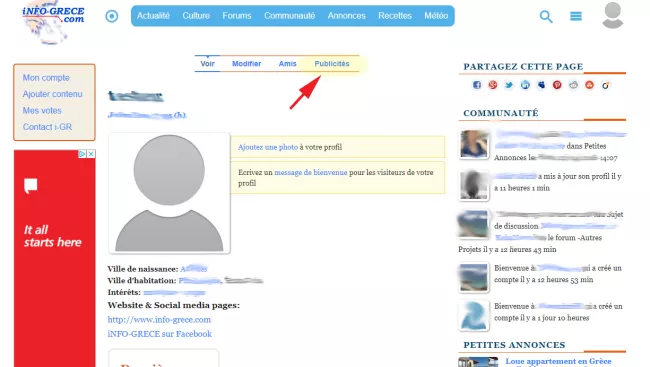 1 - Depuis votre profil, vous cliquez sur le lien "Publicités"