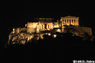 Depuis quelques mois, l’Acropole a cessé de s’embraser tous les soirs sous les coups romancés des Perses. Le « son et lumière » a cédé la place à un autre spectacle chaque soir recommencé : entre chiens et loups, l’Acropole enfile un à un ses nouveaux habits de lumière dessinés par l’éclairagiste français Pierre Bideau. Les Propylées sortent les premières de la pénombre, le soleil à peine disparu. Les portes monumentales s’éclairant de tout leur long. Puis c’est au tour du Parthénon. Le feu sacré semble brûler à l’intérieur. Les couleurs sont chaudes tandis qu’une lumière blanche illumine l’ensemble. Les moindres détails de l’édifice sautent aux yeux. Même sous la lumière du soleil, les cannelures des colonnes ne se font pas aussi précises que sous l'éclairage artificiel.