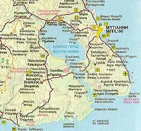 Pour se rendre à Gera, on prendra la sortie nord-ouest de la ville de Mytilène. A dix kilomètres de la capitale de l'île, on pourra faire un premier arrêt aux sources d'eau chaude, à Loutra. Dans le temps, les sources étaient à l'entrée du golfe. Aujourd'hui, il ne reste plus grande chose, à part les sources qui se trouvent dans la mer. Les amateurs des sources guérisseuses trouveront satisfaction quelques kilomètres plus loin à Therma au centre de la baie, un des plus importants biotopes grecs, avec des milliers d'espèces animales et végétales.