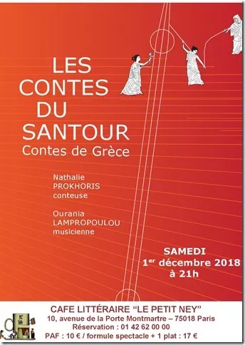 Les contes du santour - Prokhoris/Lampropoulou Il était une fois... Μια φορά κι έναν καιρό... Un parcours vagabond à la rencontre d'histoires au parfum familier mais néanmoins singulier, puisées dans le répertoire de contes populaires de Grèce et... Dates et Lieux Samedi, 1 décembre 2018, 21h Le Petit Ney Paris (75, FR)